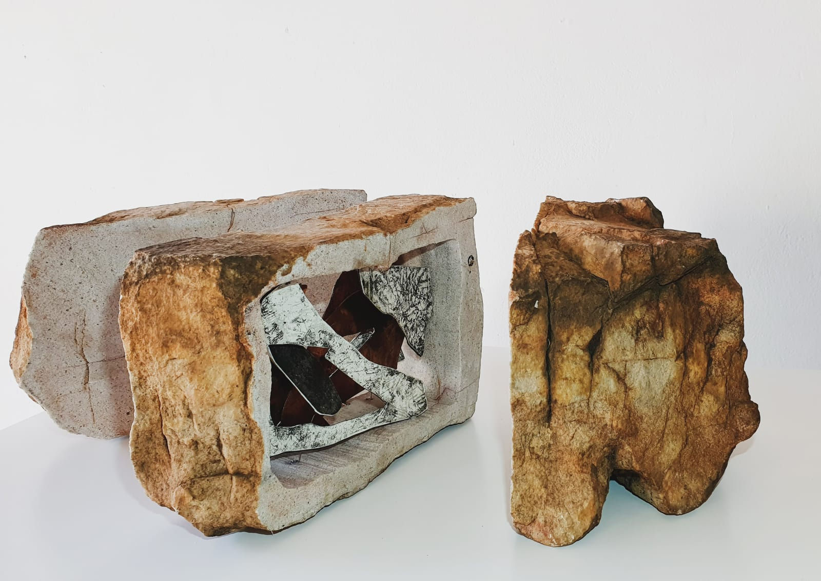 A: For my sculptures, the process begins with rocks—found forms that already carry a sense of presence. I study them, arrange them, and consider how they might interact to form a balanced, almost meditative composition. Steel sheets are then hammered and shaped against these rocks, echoing their form without fully imitating it. Once welded, the sculptures are left to the elements, particularly rain, which oxidizes the surface over time. This slow collaboration with nature becomes part of the piece’s voice—adding texture, colour, and a sense of weathered history.With my charcoal drawings, the process is similarly layered but more ephemeral. I draw detailed landscapes—often featuring sheep—onto fibre cement using charcoal, and then deliberately disrupt the image by pouring water over it. This act, repeated multiple times, washes away parts of the drawing while leaving behind stains, drips, and smears. The result is an image in flux—a surface marked by intention and surrender, by what is made and what is undone. It’s a ritual that speaks to transformation, memory, and spiritual presence.Both processes involve tension and release, precision and erosion. Whether working in steel or charcoal, I’m interested in how material carries meaning—and how gesture, time, and process can turn an object or image into something contemplative and alive.