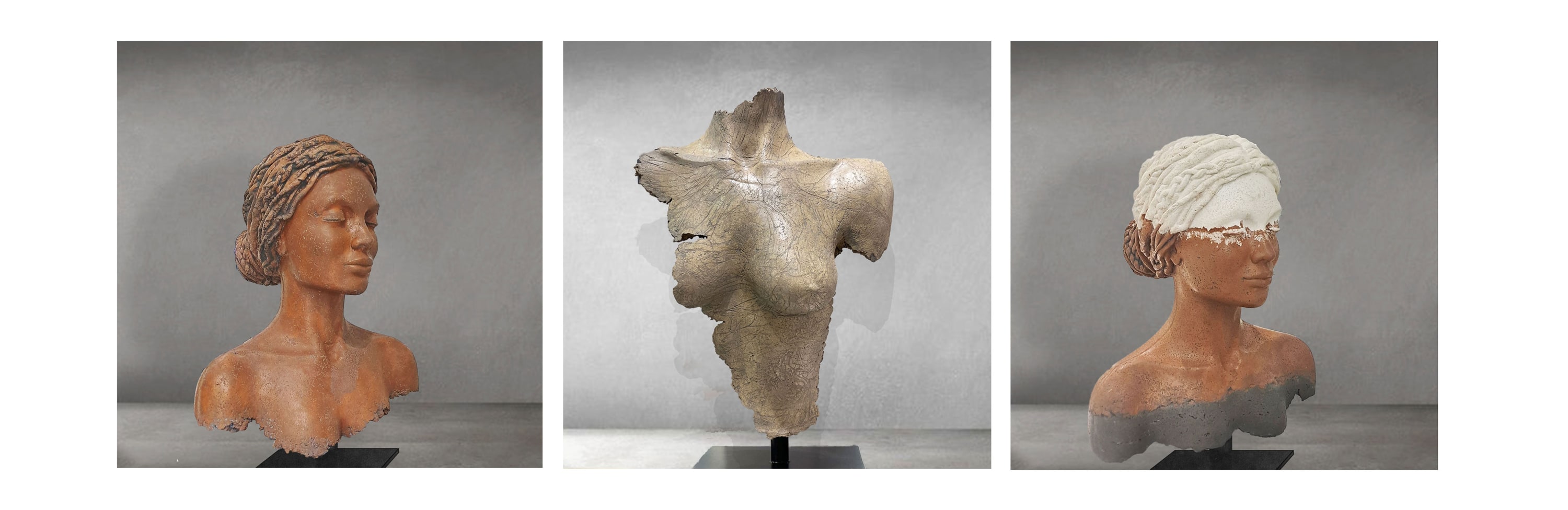 A: Everything is sacred but my theme is about the divine and the sacred feminine. My sculptures are old muses and because I have chosen the feminine as a theme running through all my work, I am celebrating the feminine that carries wisdom and inner strength. On some sculptures, phrases that come to mind while I am making Her, I write into her, especially my sculptures of torsos and very large faces, so that people can walk away thinking.
